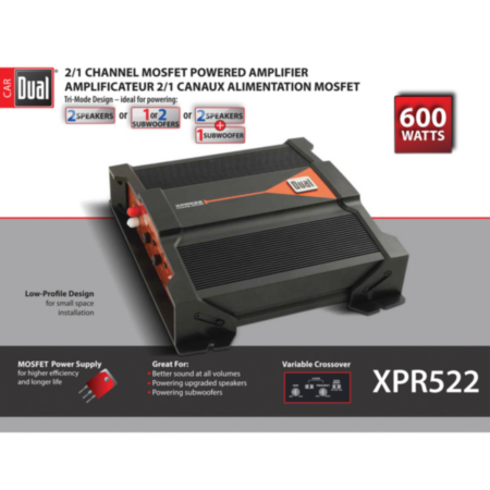 Other advanced features include the variable high and low crossover variable bass boost and a bi-color LED status indicator. The Dual Electronics XPR522 21 Channel MOSFET Powered Amplifier boasts a wide selection of features that makes this amplifier the perfect choice for you. 44 out of 5 stars.