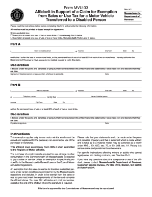 The persons who work the ticket booth will review all the paperwork with you before they give you a ticket in order to expedite the process and aid you. View download and print Mvu-29 - Affidavit In Support Of A Claim For Exemption From Sales Or Use Tax For A Motor Vehicle Purchased Outside Of Massachusetts - 1999 pdf template or form online. I declare under the pains and penalties of perjury that I have reviewed this affidavit and the statements I have made in it and declare that theyand did not receive and am not entitled to receive a credit or refund of any tax previously paid in the state inPlease read the instructions below before completing this form and provide the following informationThis claim.