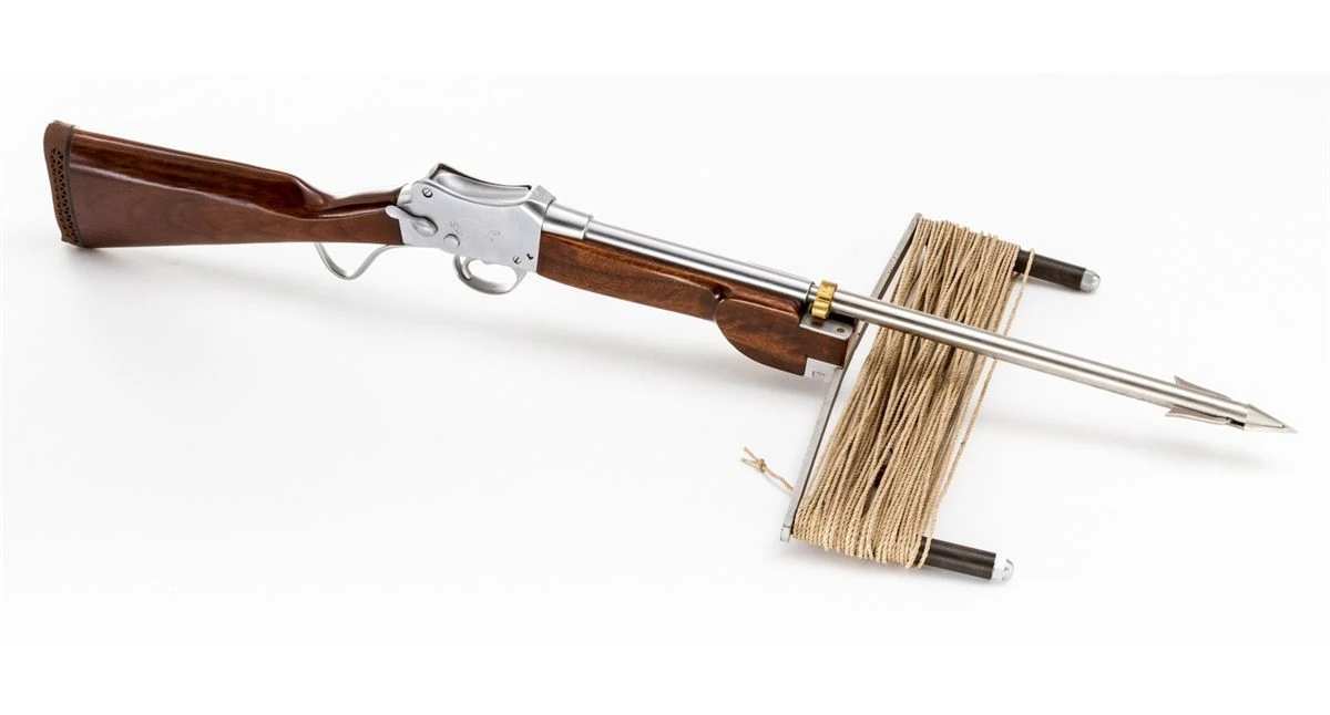 Greeners Light Harpoon Gun - Single Shot Martini Type Action - Unknown Caliber - 20 Inch Round Barrel - Looks Like a Smooth Bore of about 22 Caliber at the muzzle end - The Barrel is meant to hold and project a Harpoon with Line and obviously needs no rifling - The Rear Sight is a Lyman Peep sight and the front sight is a Bead sight mounted in a Dovetailed Base - There. Greener Harpoon Gun for sale online. It functions by sliding a hollow harpoon over the barrel which is propelled by firing a specially made 38 Special high powered blank.